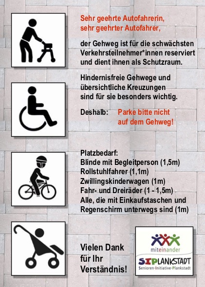 Die SIP und der GSV haben nun in Kooperation eine Idee der Senioreninitiative Ketsch übernommen, denn nicht nur in Plankstadt verstärkt sich das Risiko, sondern in ganz Deutschland findet man bei Internetrecherche vergleichbare Aktionen gegen das Gehwegparken.