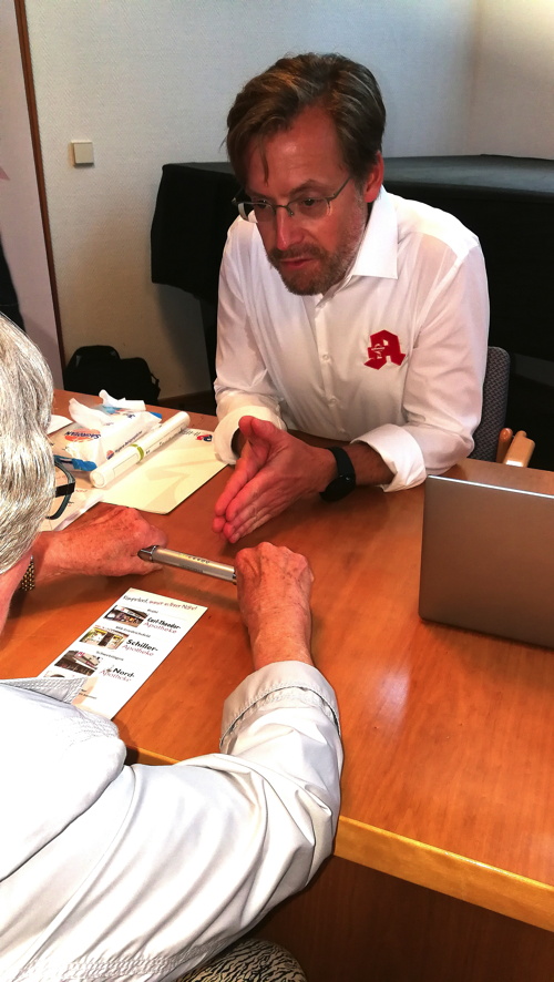 Nach dem Vortrag gab es für die anwesenden Besucher die Möglichkeit, sich einem sogenannten Screening zu unterziehen. Mit einem Diagnose-Stick wird für eine Minute der Herzrhythmus gemessen und auf Unregelmäßigkeiten überprüft. Dr. Sommer und Herr Köhler von der Nord-Apotheke in Schwetzingen hatten viel zu tun, bis alle Besucher den Test absolviert und viele Fragen gestellt hatten.