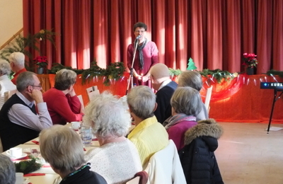 In diesem Jahr fand die Adventfeier mal wieder im Gemeindesaal der ev. Kirche statt. Schon beim Betreten des Saales konnten die zahlreich erschienenen Mitglieder, die von den Vorstandsdamen Mathilde Helfrich, Annelie Probst und Marita Hundert wunderschön festlich gedeckten Tische bestaunen und zusammen mit der Bühnendekoration von Annemarie Waldeck war es für die Gäste schon mal eine Einstimmung auf die bevorstehende Adventfeier.